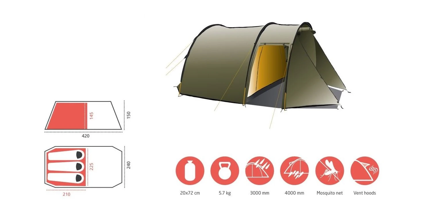 Wen Platz die größte Rolle spielt. ROBSON 3 ist der perfekte Begleiter für Ihre nächste Rad- oder Kanutour. Dank der einheitlichen Höhe im Innenzelt und in der Apsis bietet das Zelt ausreichend Platz für drei bis vier Personen im Schlafbereich und viel Platz für Ausrüstung und Gepäck in der Apsis. ROBSON 3 hat eine hervorragende Windbeständigkeit an der Längsseite. Die Moskitonetze am Innenzelt und die großen Belüftungsöffnungen mit Abdeckung auf der Außenplane sorgen für eine hervorragende Luftzirkulation und ein stets angenehmes Raumklima im Innenzelt.