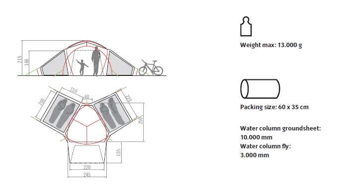 • Außenzelt: 100% Polyester 75 D Polyurethane coated 3.000 mm