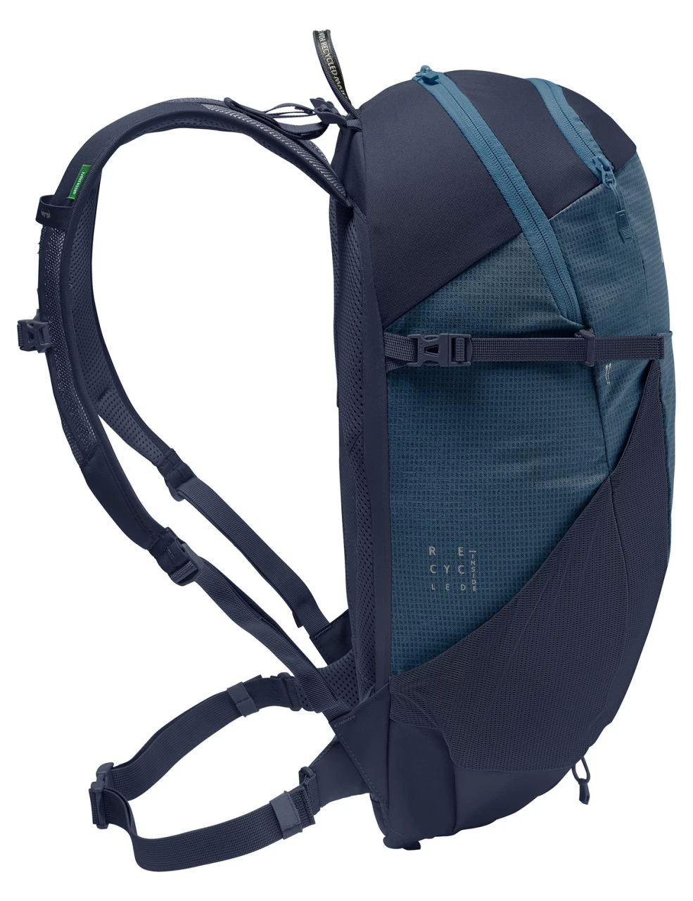 Modern und alltagstauglich – der Toploader Rucksack Neyland Zip 20 mit abnehmbarem Hüftriemen. Dieser multifunktionelle Rucksack eignet sich fürs Wandern und Klettersteige genauso wie für Uni und Stadtalltag. Das innovative Rückensystem mit den strukturierten Schaumstoffmodulen sorgt für eine gute Belüftung und gleichzeitig für einen stabilen Rückenkontakt. Die Schulterträger sind weich gepolstert und sorgen für einen guten Tragekomfort. Die integrierte EMP Platte (ergonomic movement panel) unterstützt die natürliche Rückenbeugung beim Aufstieg oder auf dem Fahrrad und verhindert, dass das Gepäck auf den Rücken durchdrückt. Ausgestattet ist der vielseitige Wanderrucksack mit einem großen Hauptfach und einem separaten Trinksystemfach, das alternativ auch als Laptopfach (bis 15″ Zoll) verwendet werden kann. Die großzügige Reißverschluss-Fronttasche hat zusätzlich ein gepolstertes Handyfach. In die seitlichen Stretch-Taschen passen Getränk oder Mütze. Wanderstöcke können an der Stockbefestigung befestigt werden und die seitlichen Kompressionsriemen dienen als weitere Gepäckfixierung. Weiteres Gepäck kann in die offene Stretchtasche auf der Front verstaut werden. Eine Regenhülle ist inklusive. Der Neyland Zip 20 wurde aus überwiegend recyceltem Material hergestellt und ist außerdem klimaneutral: Die Emissionen aus Materialien, Herstellungsprozess und Versand wurden ganzheitlich ermittelt und systematisch reduziert. Aktuell nicht vermeidbare Emissionen wurden vollständig über die unabhängige Non-Profit-Organisation „myclimate“ kompensiert. Das VAUDE Green Shape-Label steht für ein umweltfreundliches, funktionelles Produkt aus nachhaltigen und bluesign® zertifizierten Materialien.